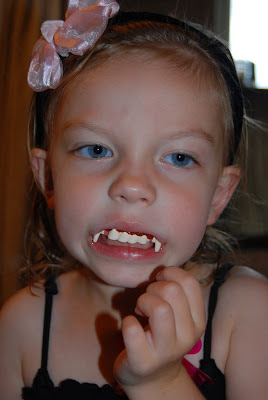 She loves these teeth. She sometimes uses them as her "mad kitty" teeth. Today they are vampire teeth that needed to be flosses.